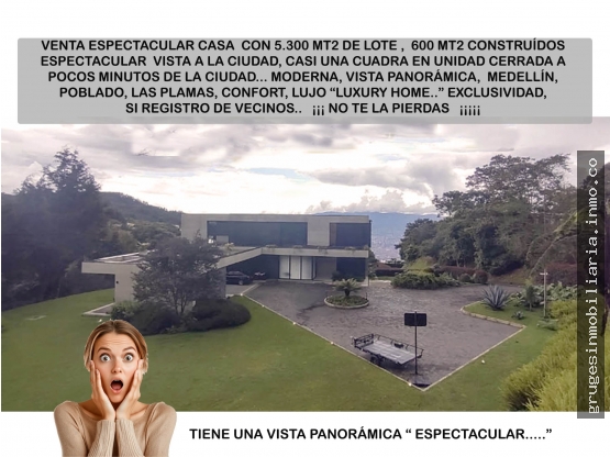 Pesos Colombianosventa de espectacular casa campestre en medio de la ciudad y con 5.300 mt2 de lote Venta casa campestre poblado palmas vista panorámica elegancia exclusividad Vive hermosos momentos con familia y amigos en el amplio balcón con una increíble vista, disfruta lo maravilloso de la naturaleza desde cualquier lugar de esta casa a través de las paredes de ventanas que dejan al descubierto un entorno mágico y natural, pero conservando siempre tu privacidad. A solo 5 minutos del Centro Comercial El Tesoro se encuentra esta casa de arquitectura moderna y minimalista, ubicada en el mejor rincón de una de las más exclusivas y seguras unidades campestres de la ciudad de Medellín. Rodeada de árboles y naturaleza, en donde podrás disfrutar de su inmenso jardín Rodeada de árboles y naturaleza y lo mejor…. excelente vista a la ciudad . Rodeada de naturaleza, pero también con una vista espectacular de la ciudad, en condominio privado y a solo 10 minutos de las mejores tiendas, los mejores restaurantes, escuelas con alta calificación, entidades financieras y todo lo que necesitas. Esta impresionante propiedad con altos acabados se encuentra en la exclusiva zona residencial de Medellín Las Palmas en El Poblado. Cuenta con facilidades de acceso y transporte. Cerca de todos los servicios y en medio de la naturaleza. lujosa y cómoda casa de 2 niveles Cuenta con cuatro habitaciones con baño y Vestier, baño social y habitación de empleada completa. Parqueadero para 3 carros cubiertos y 5 descubiertos. Tiene un lote de 5.300 metros ,casi 1 cuadra…. en la ciudad de Medellín, y 600 metros cuadrados de construcción, con una espectacular vista que provoca envidia. Valor venta $ 9.500 nueve mil quinientos millones de pesos colombianos valor en dólares usd $ 2.260.000 dos millones doscientos sesenta mil dólares aprox. Para finalizar….. Si este es tu presupuesto , si te interesa esta propiedad y llena tus expectativas de inversión, No dejes pasar la oportunidad, no dudes en llamarme e iremos a conocer esta excelente opción de inversión, y esta belleza de propiedad . Con nuestros servicios, y con nuestra asesoría personalizada durante todo el proceso, compras fácil, rápido y seguro esperamos tu llamada La tasa de cambio se revisará al momento del cierre. ENGLISH Country house for sale in poblado palmas panoramic view elegance exclusivity Live beautiful moments with family and friends on the large balcony with an incredible view, enjoy the wonders of nature from anywhere in this house through the walls of windows that expose a magical and natural environment, but always preserving your privacy. Just 5 minutes away from El Tesoro Shopping Center is this house of modern and minimalist architecture, located in the best corner of one of the most exclusive and safe country units in the city of Medellin. Surrounded by trees and nature, where you can enjoy its immense garden Surrounded by trees and nature and the best .... excellent view of the city. Surrounded by nature, but also with a spectacular view of the city, in private condominium and only 10 minutes from the best stores, the best restaurants, highly rated schools, financial institutions and everything you need. This impressive property with high finishes is located in the exclusive residential area of Medellin Las Palmas in El Poblado. It has easy access and transportation facilities. Close to all services and in the middle of nature. Luxurious and comfortable house of 2 levels. It has four bedrooms with bathroom and dressing room, social bathroom and complete maid's room. Parking for 3 cars covered and 5 uncovered. It has a lot of 5,300 meters, almost 1 cuadra.... in the city of Medellin, and 600 square meters of construction, with a spectacular view that causes envy. Sale value $ 9,500 nine billion five hundred million Colombian pesos value in dollars usd $ 2.260.000 two million two hundred and sixty thousand dollars approx. To finalize..... If this is your budget, if you are interested in this property and fill your investment expectations, do not miss the opportunity, do not hesitate to call me and we will go to meet this excellent investment option, and this beautiful property. With our services, and with our personalized advice throughout the process, buying easy, fast and safe waiting for your call. The exchange rate will be reviewed at the time of closing.