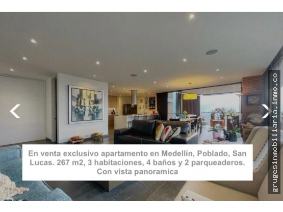 Pesos ColombianosVenta de Espectacular Apartamento en Poblado San Lucas – Elegancia y Comodidad en Cada Espacio Este hermoso apartamento, ubicado en una de las mejores zonas residenciales de Medellín, ofrece 267 m² de lujo, comodidad y estilo de vida exclusivo. Diseñado para quienes valoran la privacidad, la funcionalidad y el acceso a las mejores comodidades, este inmueble es una verdadera joya. • 267 m² • 3 Habitaciones • 4 Baños • 2 Parqueaderos Valor: $ 2.600.000.000 ¡Haz realidad el sueño de vivir en uno de los lugares más cotizados de Medellín! Contáctanos para obtener más información y agendar una visita. Con nuestra asesoría personalizada, tu compra será fácil, rápida y segura.